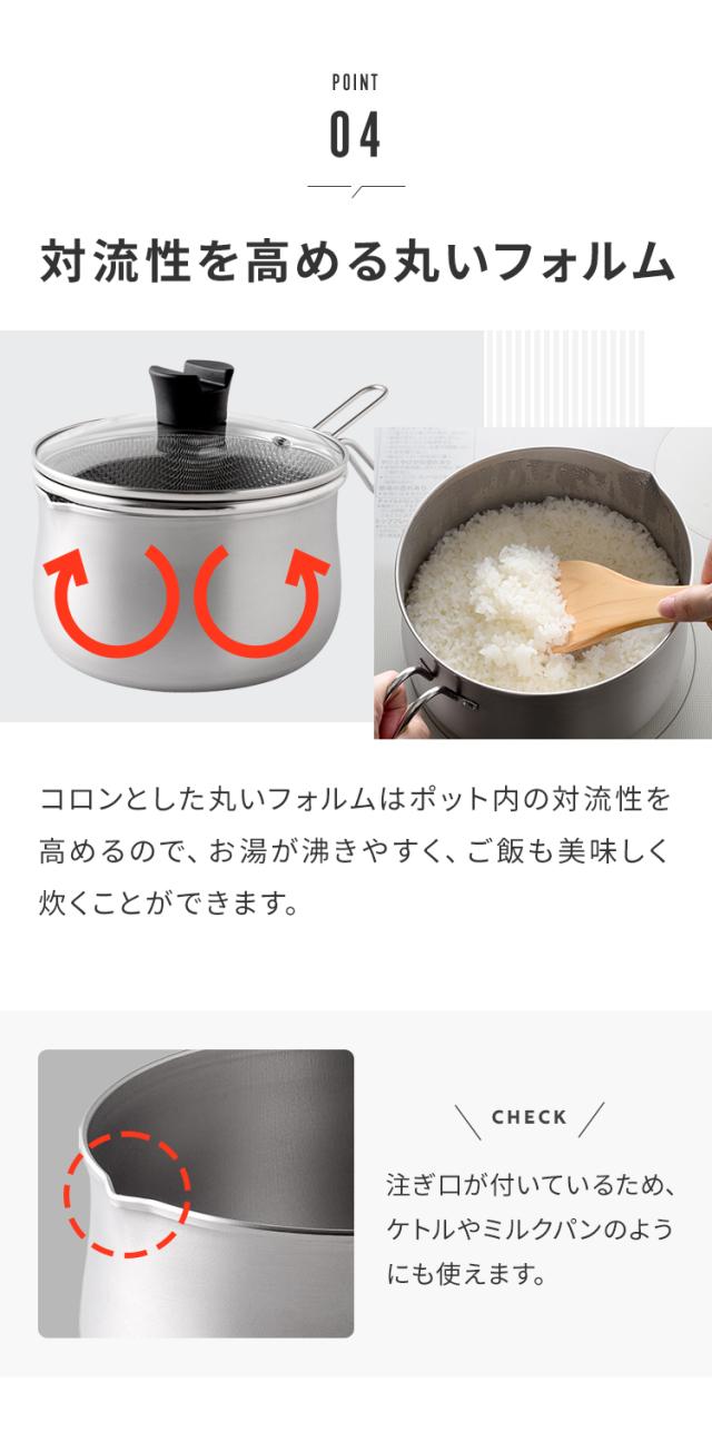 ■丸みのあるフォルムなので対流によりお湯が沸き易く、ご飯も美味しく炊けます。注ぎ口が付いているのでケトルやミルクパンのようにも使えます。