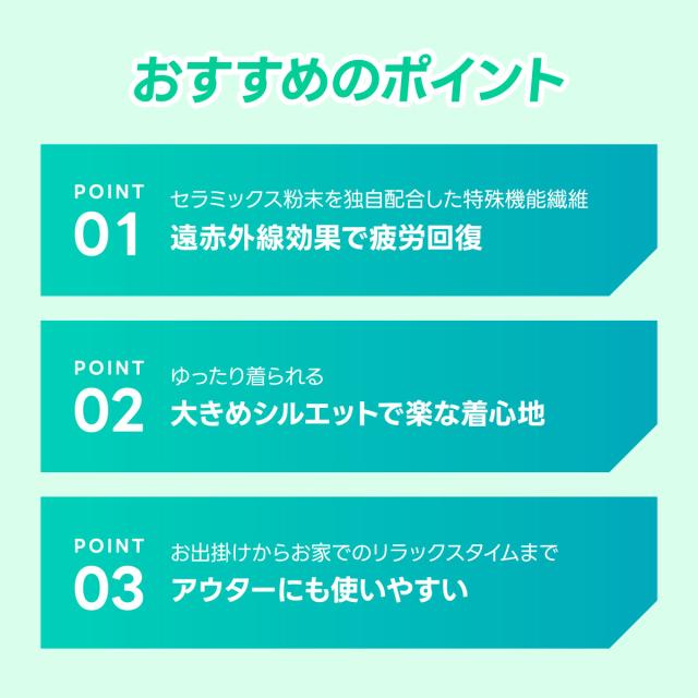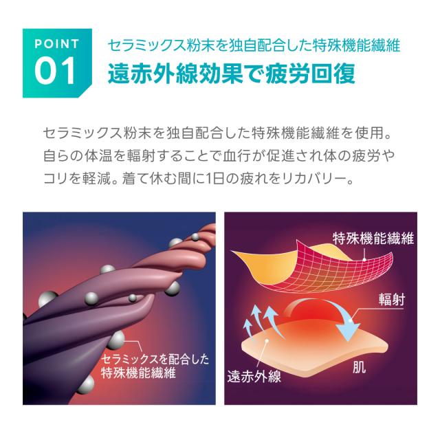 セラミックス粉末を独自配合した特殊機能繊維を採用。遠赤外線の働きにより血行を促進し、疲労回復をサポートします。さらに、ハリやコリの緩和にも役立つため、日常のケアウェアとして取り入れやすい一枚です。
