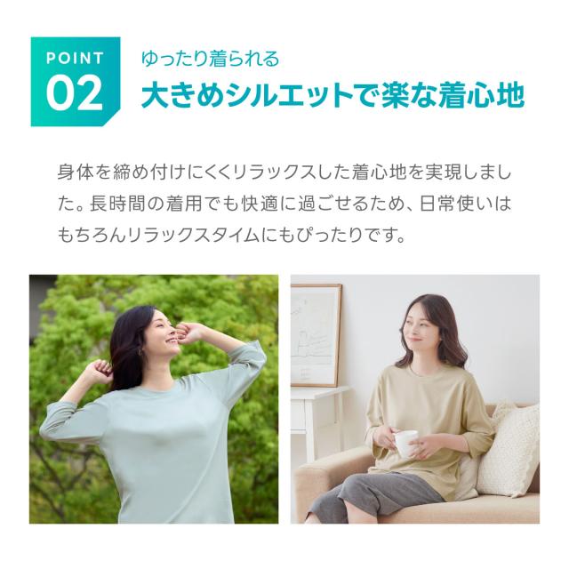 ゆったりとした大きめシルエットで、身体を締め付けにくくリラックスした着心地を実現。長時間の着用でも快適に過ごせるため、お家でのリラックスタイムや就寝前のくつろぎ時間にもおすすめです。