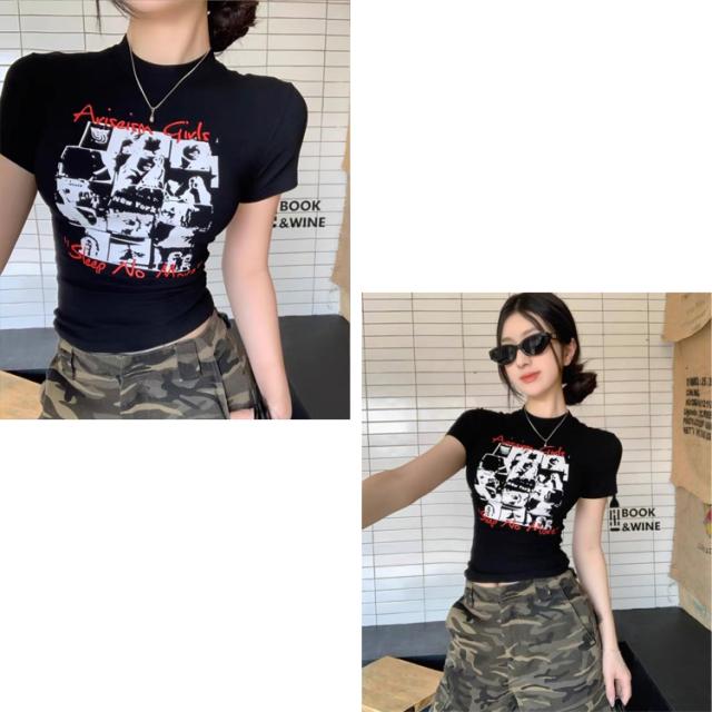 全品送料無料一部除く モノクログラフィックデザイン スリムTシャツ ma 【即納】トップス 半袖 半袖Tシャツ コンパクト スリムトップス タイトトップス モノクロ 白 フォトプリント レディース 韓国 Y2Kファッション 韓国ストリート 流行り トレンド かわいい