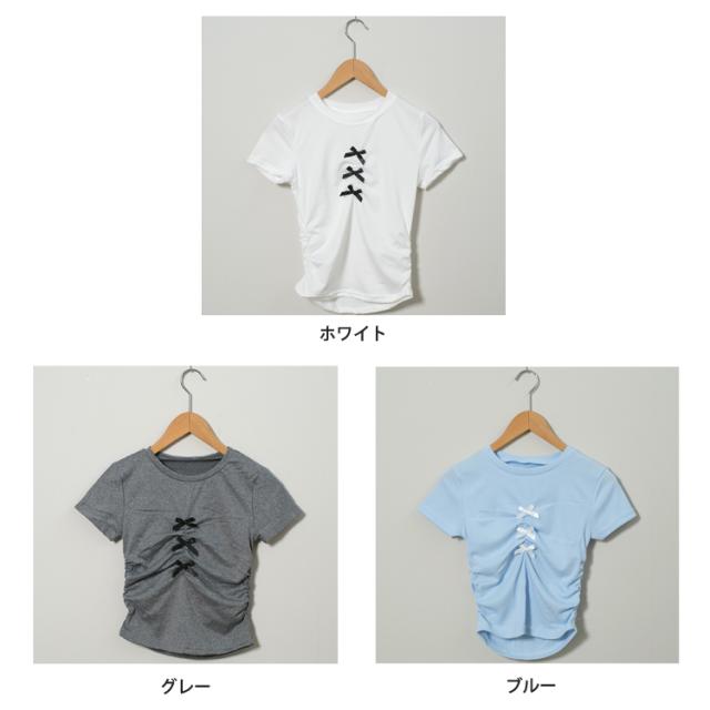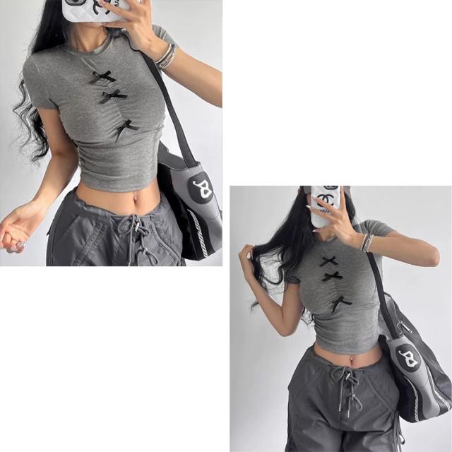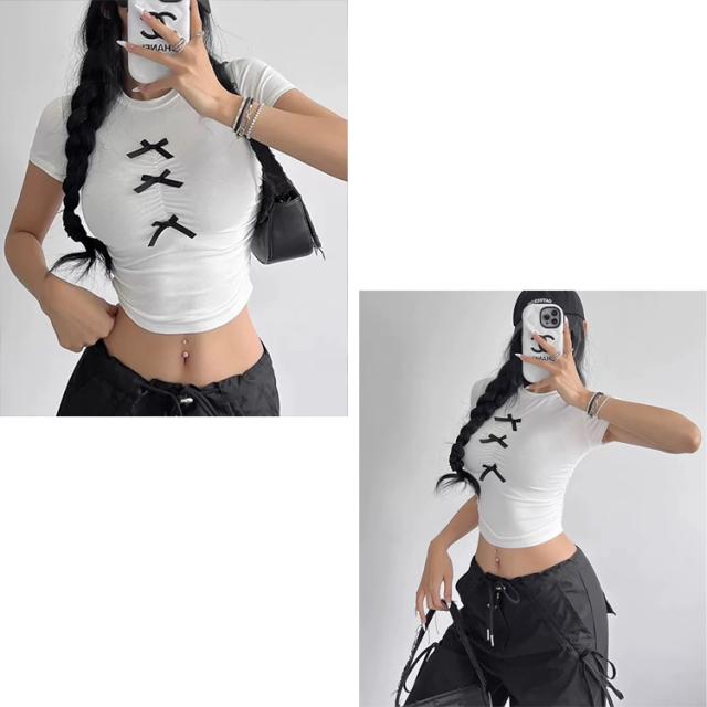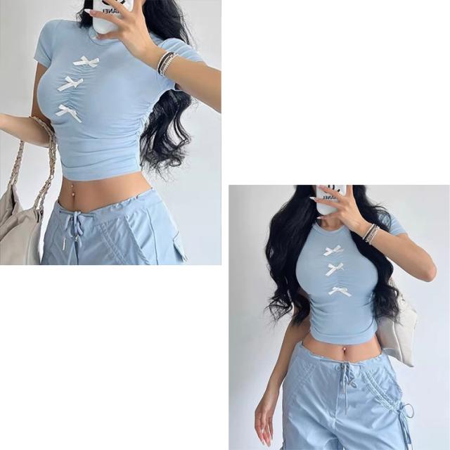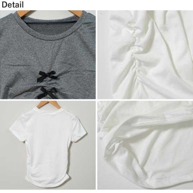 全品送料無料一部除く フロントリボン ギャザーデザイン チビTシャツ ma 【即納】トップス 半袖 半袖Tシャツ チビT ミニT ショート丈 クロップド丈 ミニ丈 スリムトップス タイトトップス リボン シャーリング くしゅくしゅ レディース 韓国 流行り トレンド かわいい