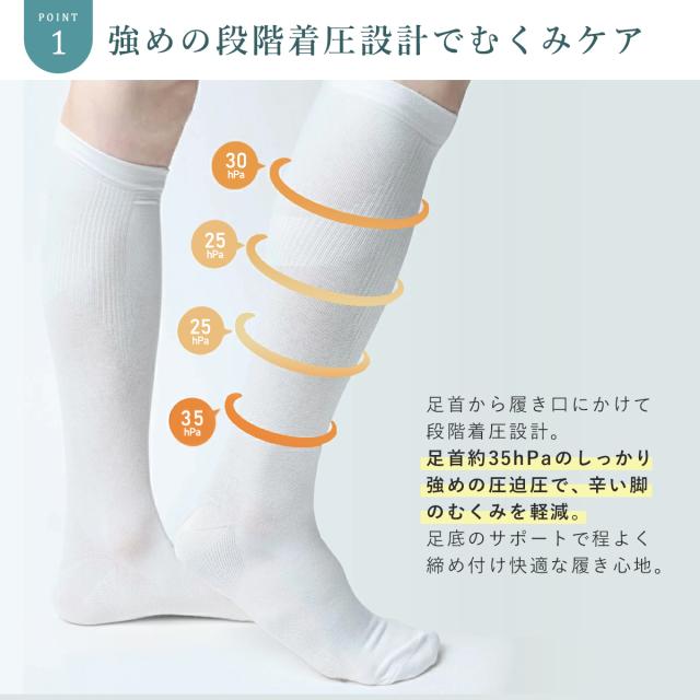 足首を35hPaの強めの圧迫圧でしっかり引き締めて、辛い脚のむくみを軽減!