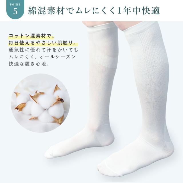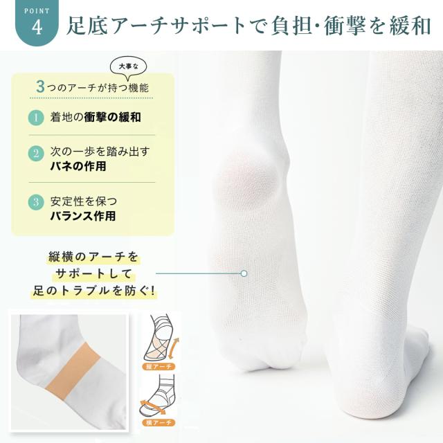 強圧サポート着圧ソックスは、足底の編みを変え、足のアーチをサポート。