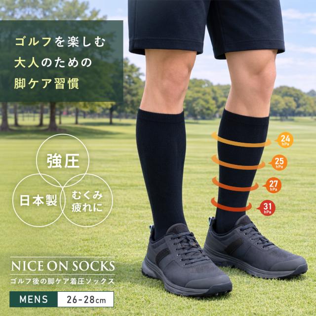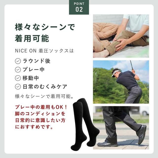NICE ONソックスは、日本製のしっかりとした強圧設計で、脚を心地よく引き締めながら、ゴルフ後のリフレッシュタイムをサポート。