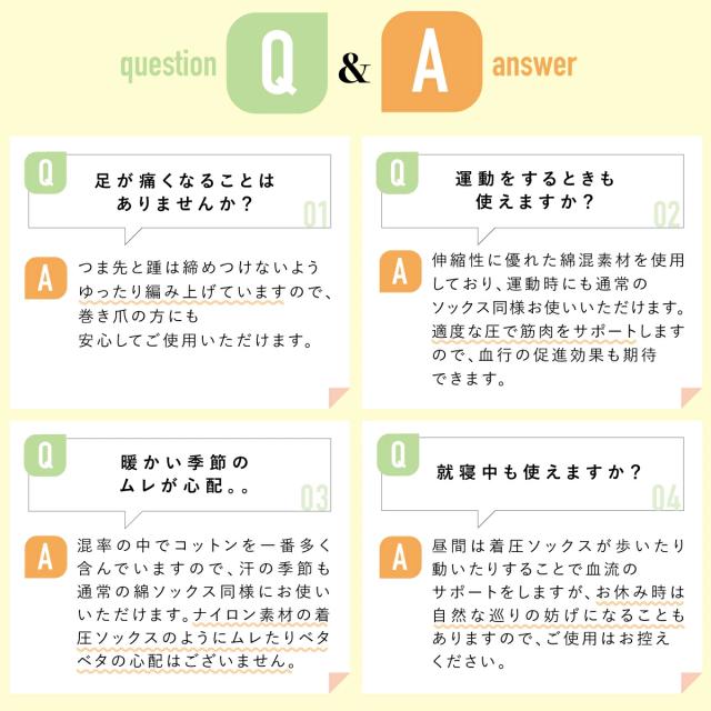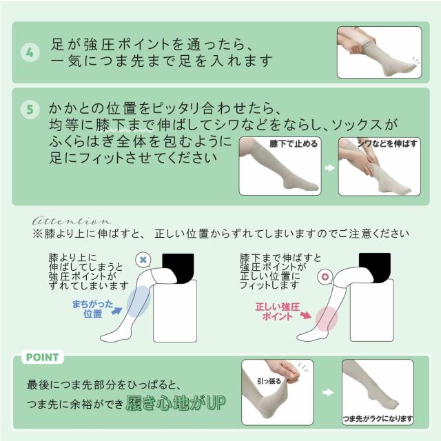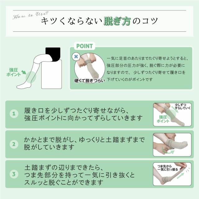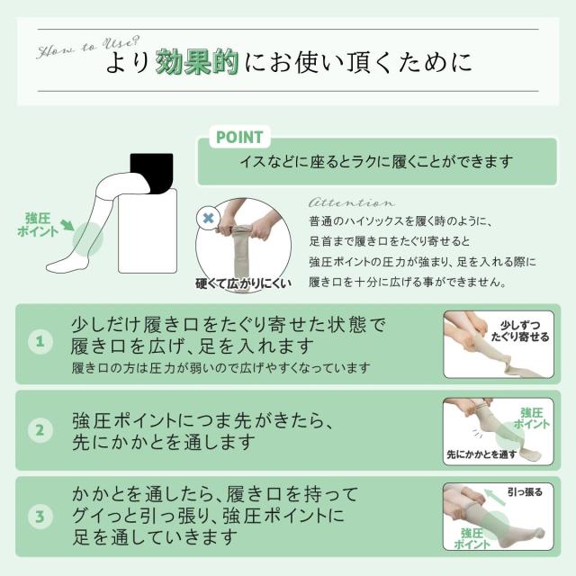 このソックスは足首からふくらはぎにかけて段階的に圧をかける設計で、脚をやさしく包み込みます。