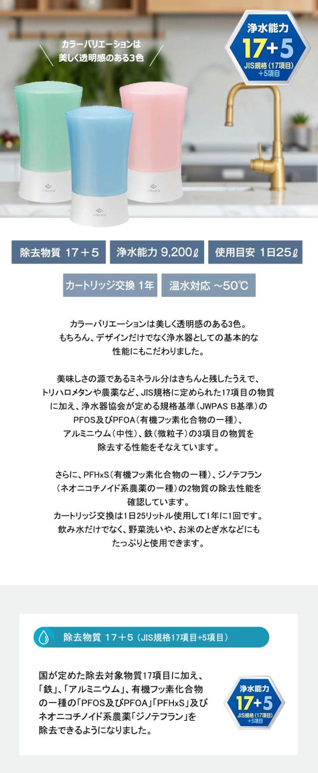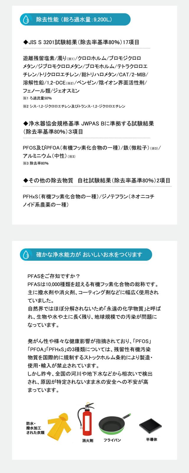 美味しさの源であるミネラル分はきちんと残したうえで、トリハロメタンや農薬など、JIS規格に定められた17項目の物質に加え、浄水器協会が定める規格基準(JWPAS B基準)のPFOS及びPFOA(有機フッ素化合物の一種)、アルミニウム(中性)、鉄(微粒子)の3項目の物質を除去する性能をそなえています。