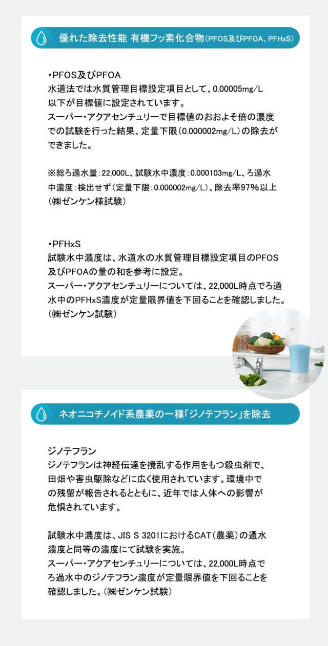 さらに、PFHxS(有機フッ素化合物の一種)、ジノテフラン(ネオニコチノイド系農薬の一種)の2物質の除去性能を確認しています。
