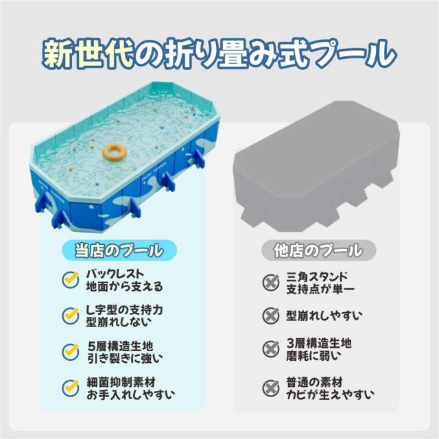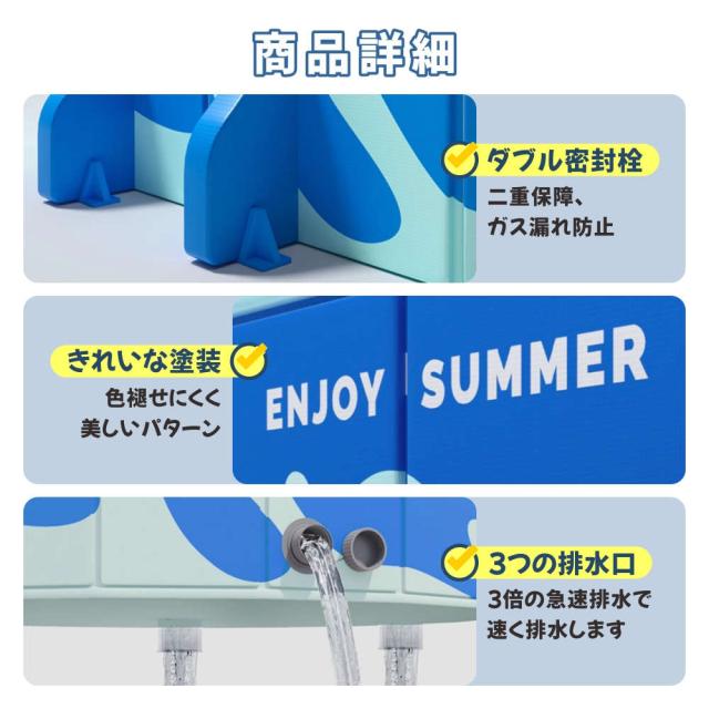 | 【特徴】 | 【使いやすさが魅力のプール】:折りたたみプール、組み立て不要、めんどな空気入れする必要がなく、穴が開いて萎んでしまう心配もございません!わざわざ高価な電動エアーポンプを購入する必要もない!屋外でも室内でも使える、暑い季節に大活躍!普段使わないときは、折りたたんでコンパクトに収納! 【滑り止め、ペットと子供に安全】: 折りたたみ式プールは、内壁と底の両方に厚い滑り止め素材を備えており、水を楽しんでいるときに滑りや落下を防ぎます。 子供用プールの側面では、子供やペットが簡単に飛び越えて水遊びを安全に行うことができます。 【様々な使い方】暑い夏は水遊びを楽しみます。寒い日は、プールにお子様のお気に入りのおもちゃを入れたり、カラーボールを入れたりして、遊び場になります。お子様が思う存分遊んでいただけます。自宅や公園など場所でも快適に遊べます 【広範な用途】:屋外プール、バスタブ、おもちゃの箱、1台3役で1年中使える!お子様の水遊び、大きな物を洗う、ペットバス、おもちゃ入れ、まだまだ多くの用途があります。屋内、お庭、ビーチ、屋外などいつでもどこでも簡単に使える。 |