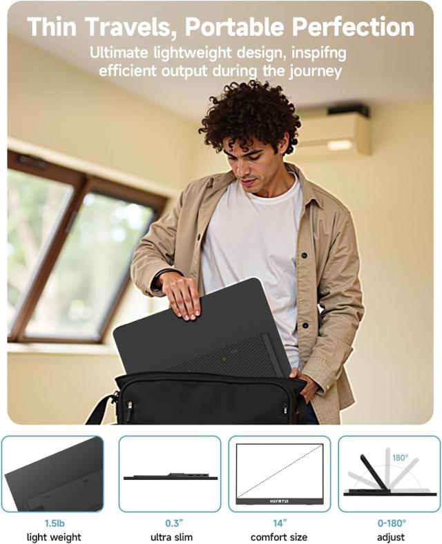 14インチモバイルディスプレイは、上下178°、左右178°の広範な視野角を持つIPS液晶パネルを採用しています。