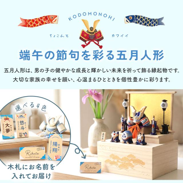 端午の節句に、男の子の健やかな成長を願って飾る五月人形。 伝統の美しさと、思わずほっとする可愛らしさを兼ね備えたデザインです。 コンパクト設計で、玄関やリビングにも飾りやすく、インテリアとしても楽しめます。 台座は収納箱になっており、出し入れも簡単で毎年気軽に飾れます。 桐箱に入っていますので、ギフトにもピッタリ! さらに、お名前入りの木札付きで特別感もプラス。 初節句のお祝いギフトにもぴったりな、心温まる五月人形です。 \ お名前入り木札 / お子さまのお名前と生年月日を入れた、世界にひとつだけの木札。 天然木のやさしい風合いで、五月人形と並べても違和感なく飾れます。 木札は選べる4種類のデザインをご用意。 漢字ひらがなカタカナ対応のデザインや、アルファベット対応デザインがあり、漢字のお名前にはふりがなもお付けいたします。 組み立て不要で、届いたその日からすぐに飾れるのも嬉しいポイント。 コンパクトながら記念に残り、初節句のお祝いにぴったりです♪ 毎年飾るたびに家族の思い出が増えていく、そんなこどもの日をお楽しみください。 |
