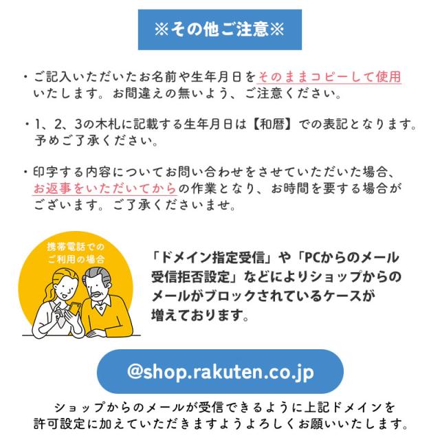 | ご購入に関するご注意 | 【商品についてのご注意】 ・五月人形は陶器製のため、強い衝撃を与えると破損する恐れがあります。お取り扱いには十分ご注意ください。 ・本製品はデザイン上、接着個所や折れやすい部分が有りますのでお取り扱いの際は十分ご注意ください。 ・職人によって一つ一つ丁寧に彩色を施しておりますが、製作工程でどうしても色むら等が発生し、若干の個体差が生じます。 手作り品ならではの特徴、味としてあしからずご了承ください。 ・手作り品のため、表示サイズと多少の差異が生じる場合がございます。 ・木札や桐箱は天然木を使用しているため、木目、色合い、サイズには個体差がございます。天然素材ならではの風合いとしてお楽しみください。 ・モニター、ディスプレイによっては写り方が変わります。 予めご了承くださいませ。 【名入れについてのご注意】 ・名入れ内容は、ご注文時にご入力いただいた内容をそのままコピーして制作いたします。誤字脱字や入力間違いがないか、必ずご確認ください。 ・デザイン【1、2、3】は漢字、ひらがな、カタカナに対応しております。漢字のお名前の場合は、ひらがなでふりがなをお付けいたします。アルファベットには対応しておりません。 ・デザイン【4】はアルファベット専用です。頭文字は大文字で制作いたします。アルファベット以外の文字には対応しておりません。 ・韓国語、ハングル、中国語、アラビア語には対応しておりません。 また、旧字体はお入れできない場合がございますので、事前にお問い合わせください。 ・書体の仕様により、同じ漢字でも形が異なって見える場合がございます。これは不具合ではございませんので、あらかじめご了承ください。 ・お名前の横または下に、生年月日が入ります。デザイン【1、2、3】は生年月日が漢字で和暦表記となります。 ・デザイン【4】をお選びの場合、生年月日は英数字での表記となります。 ・名入れ内容について確認が必要な場合、当店からご連絡を差し上げます。ご返信をいただいてからの制作となるため、発送までにお時間を要する場合がございます。 ・携帯電話の設定によっては、当店からのメールが受信できない場合がございます。@shop.rakuten.co.jp ドメインを受信許可設定に追加してください。 |