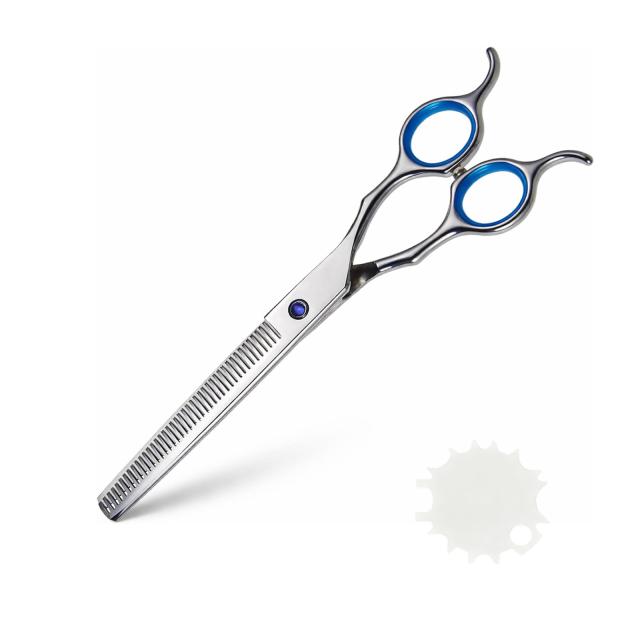 1. 【ステンレス素材】:本体はステンレス製で、日常的なお手入れに配慮された仕様です。表面はシルバーとブルーの配色です。 2. 【多歯構造と調整片】:多歯タイプの刃と調整片により、毛量を段階的に整えやすい設計です。仕上げや細部のカットにも対応します。 3. 【サイズ仕様】: 全長約18.5cmのサイズで、トリミング作業時の取り回しを考慮した形状です。 4. 【左右兼用ハンドル】:対称型ハンドルを採用し、左右どちらの手でも使用可能です。持ち手は滑りにくい設計です。 5. 【刃のかみ合わせ設計】:刃同士のかみ合わせに配慮した構造で、カット時の引っかかりを抑える仕様です。 6. 【使用シーン】:ペットの被毛の量調整や日常のトリミング、顔まわりや足元などの細部カットに使用できます。自宅でのケアやペットサロンでの仕上げ作業など、さまざまなシーンに対応します。 |