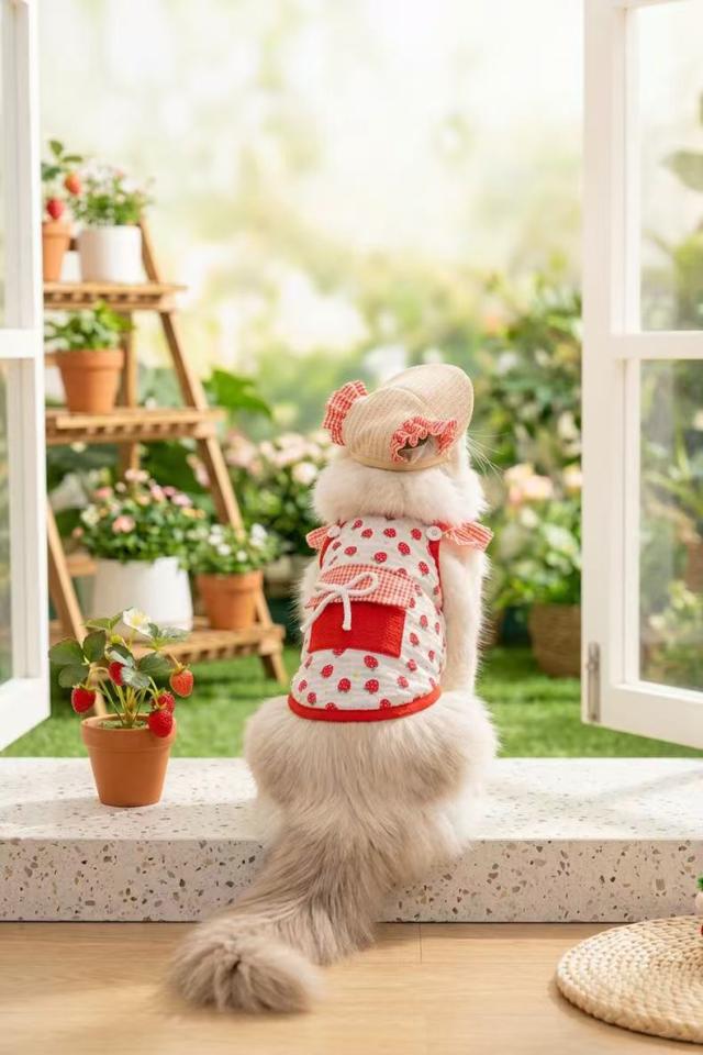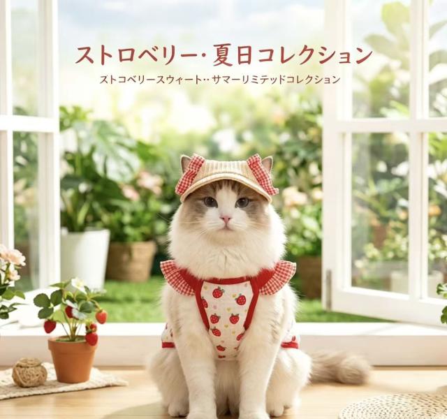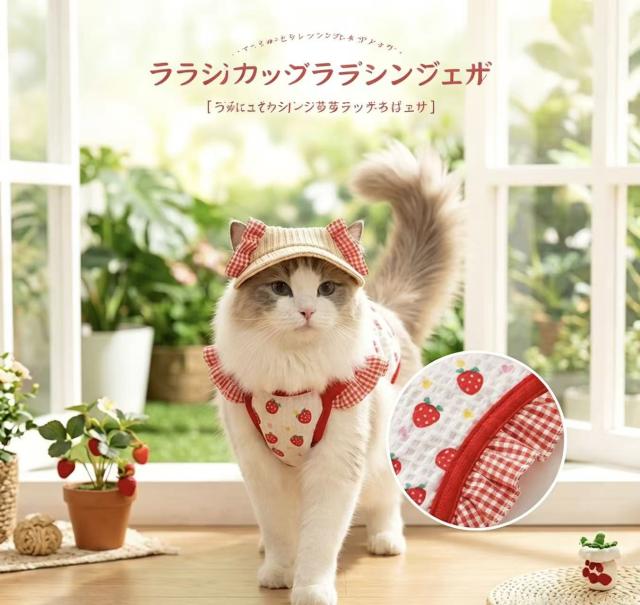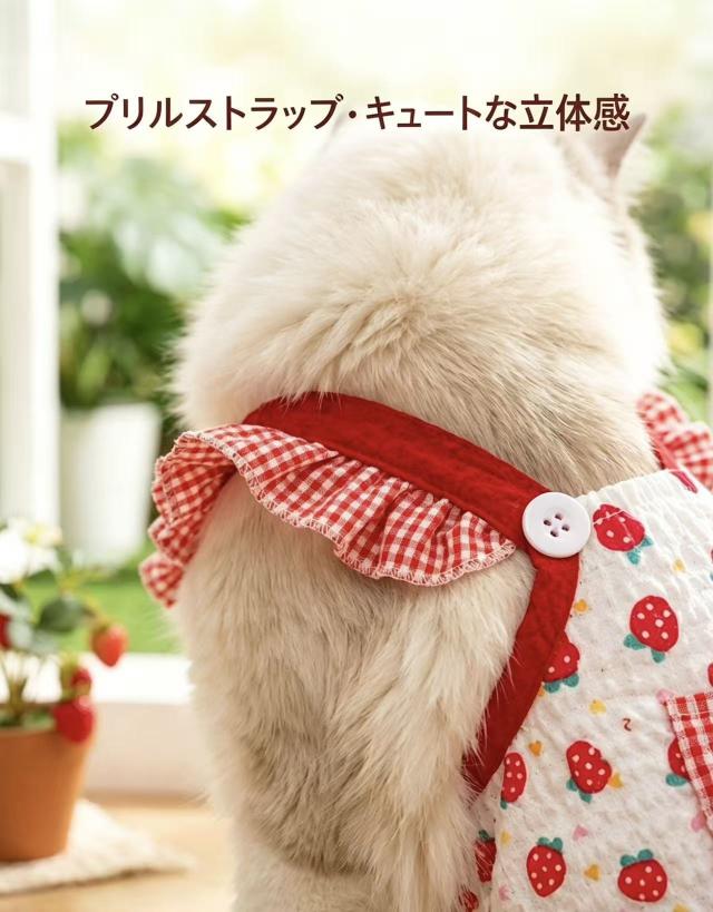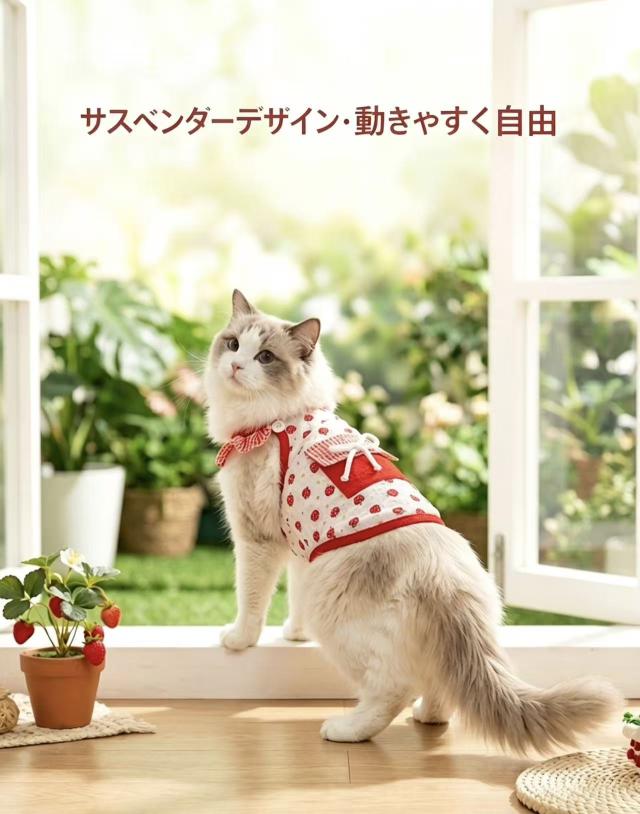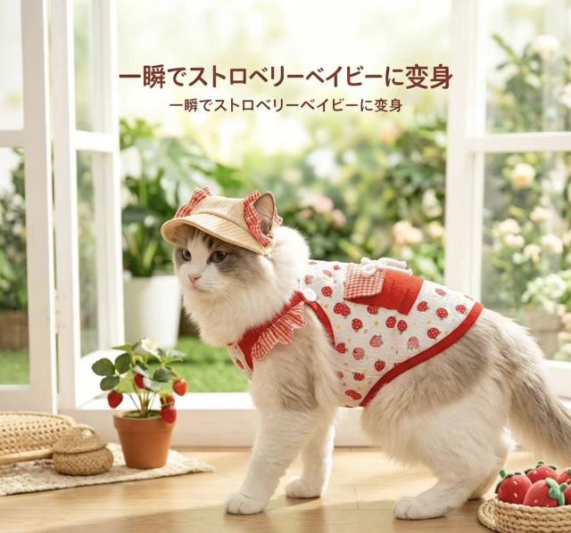 いちごのフルーツ柄とフリルデザインが、愛猫をよりキュートに演出し、SNSやお散歩でも注目を集めます。