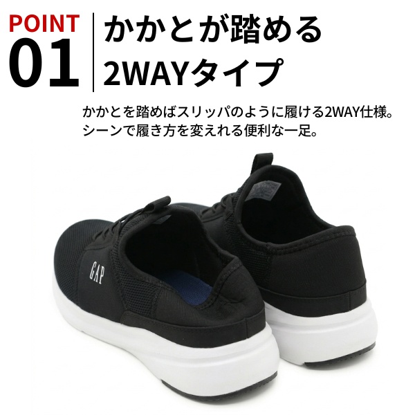 GAP ギャップ メンズ スリッポン スニーカー 黒 ブラック ネイビー 2WAY かかとが踏める 軽量 軽い GPU22607 履きやすい 歩きやすい 痛くない 疲れない クッション 脱ぎ履き楽々 カップインソール カジュアル 普段使い さっと履ける 靴