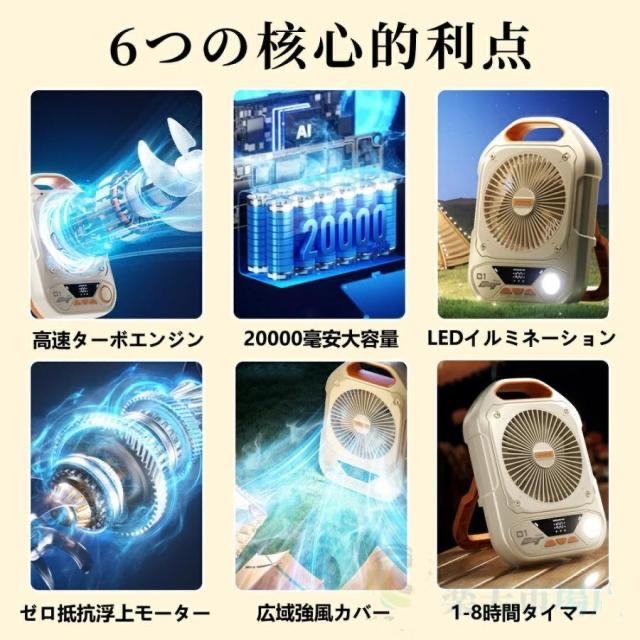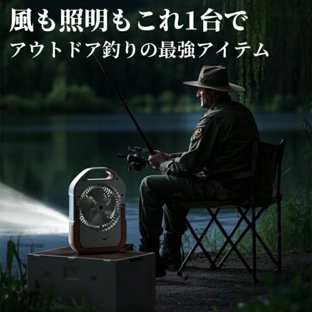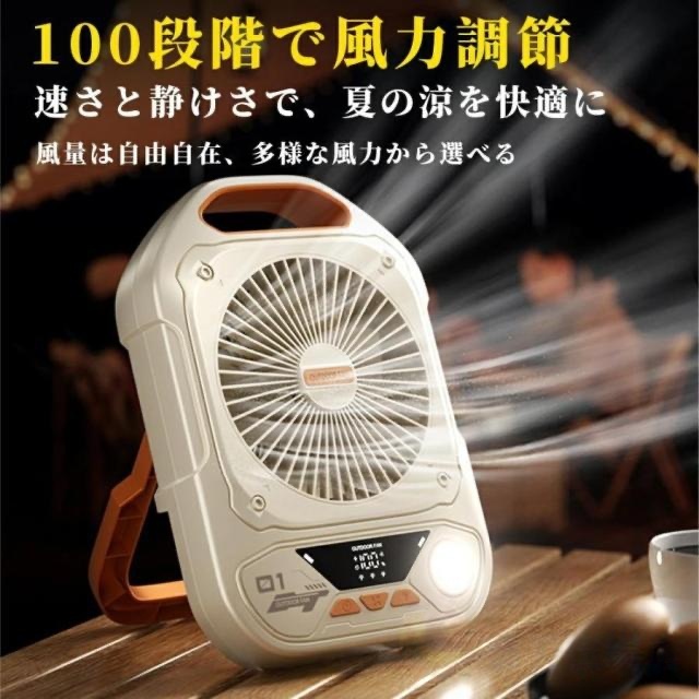 アウトドア扇風機 充電式 20000mAh大容量 卓上・吊り下げ対応 LEDライト付き 100段階風量調節 静音 軽量 タイマー機能 ポータブル キャンプ用