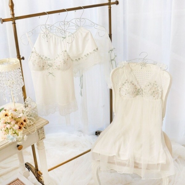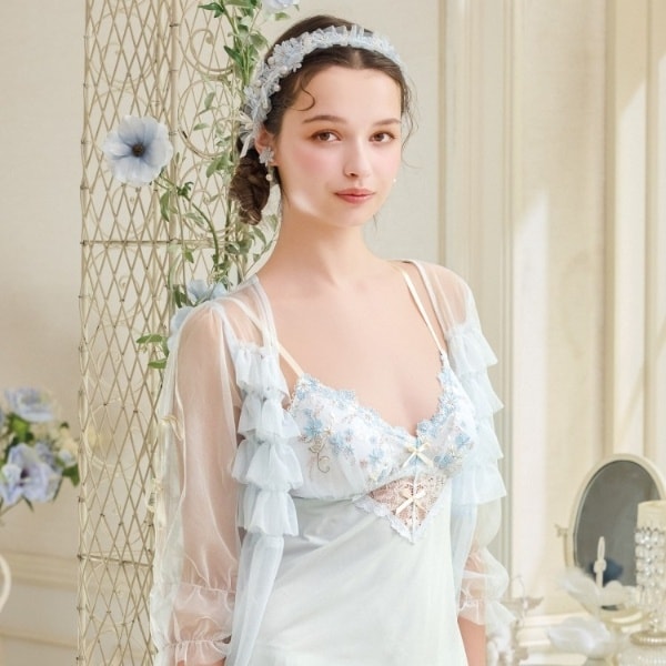 優雅なアンティークの壁紙を思わせる、繊細で上品なシリーズです。淡い色彩で彩られたお花の中にきらめくラメ糸を散りばめて、印象的な輝きを演出しました。身生地には前後でV字にカッティングしたレースをあしらい、さりげない透け感をプラス。裾にもお揃いのストレッチレースをほどこして、ふんわりと優しい印象に仕上がりました。フロントとバックスタイルにはリボンを添えて、ポイントでお花のアップリケを重ねることで、思わず心ときめく特別な印象に。フラワーガーデンを訪れたような、お花にそっと包み込まれる可憐なコレクションです。