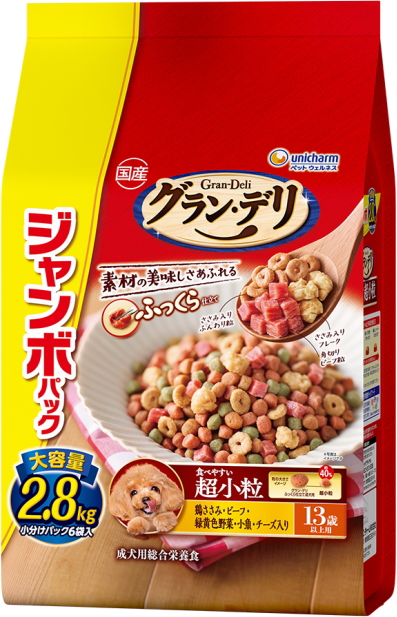 口の小さなワンちゃんでも食べやすい超小粒タイプ ※粒の大きさ約40%(グラン・デリふっくら仕立て成犬用比)総合栄養食。国産のお肉たっぷり。ふっくら仕立て。小分けパックタイプ。腰・関節の健康維持の為に、グルコサミン・コンドロイチンを配合。ビタミンEを強化(グラン・デリふっくら仕立て成犬用比約265%)、ビタミンCを配合。美味しいささみ入り大豆フレーク入り。