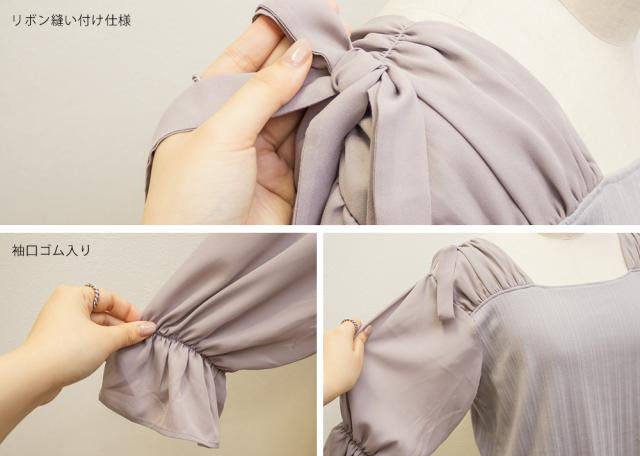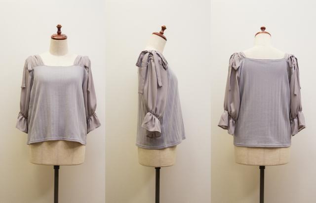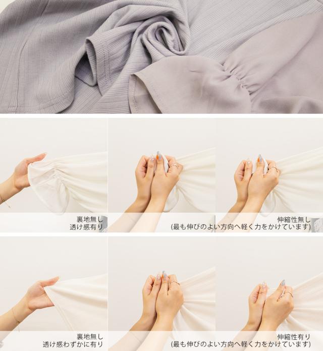 | 程よくしっかりとした伸縮性のあるカットソー素材。デコルテ/袖/リボンはやや透け感・落ち感のある伸縮性のないジョーゼット生地。 |
