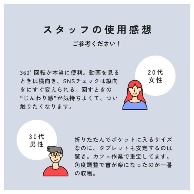 【360°無段階回転】画面を縦にも横にも自由に回せるので、動画鑑賞やSNS投稿、Web会議などシーンに合わせてすぐに方向切替。回すときの適度な抵抗感がクセになります。