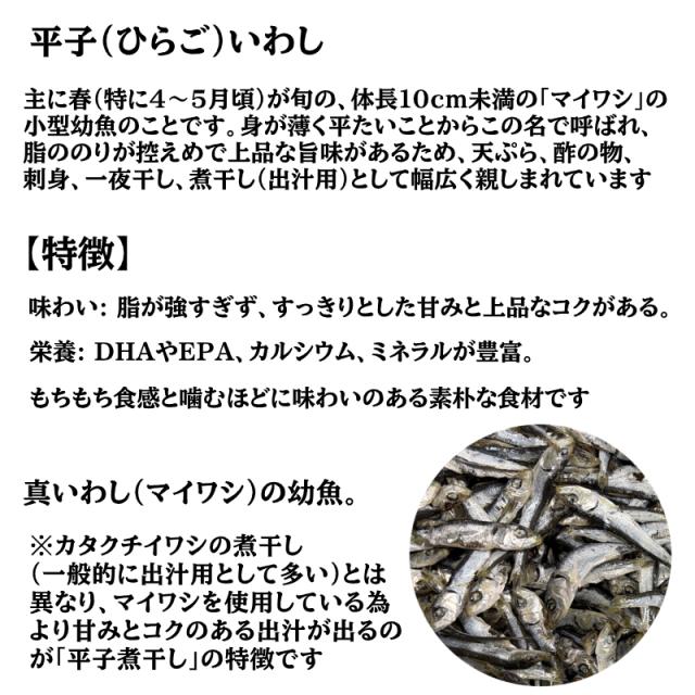 | スタッフより | 平子いわしは、『真イワシ』の稚魚を煮干しにしたもので、イカナゴ同様、春の今の時期のみの限定品です! 食べ方は、通常のちりめんと同じです。そのまま食べても良いですし、我が家は甘酢に漬けて食べます♪ 少し柔らかめの乾燥で、もちもち食感と噛むほどに味わいのある素朴な食材です。 キュウリなどと酢の物にするのが、最適かと思います。 天ぷら・唐揚げ: 小ぶりで骨が柔らかいため、丸ごと揚げて中骨まで食べられます。 酢〆・刺身: 新鮮なものは酢〆や刺身にすると美味です。 煮干し・だし: 「平子煮干し」は魚臭さが少なく、味噌汁やうどん、ラーメンの出汁に最適なんです。 一夜干し: 軽く炙って食べると濃厚な旨味が楽しめるので晩酌のアテにもオススメです。 約5cmと小さいですがカルシウムたっぷりです(^^♪ |