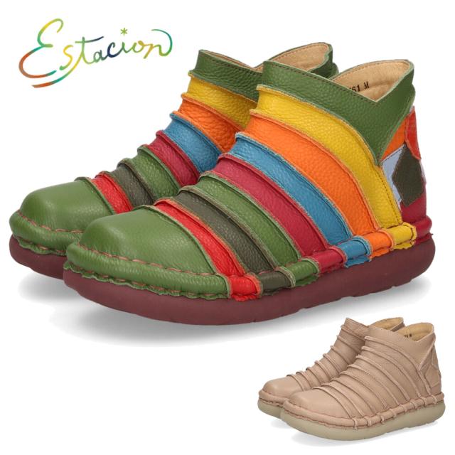 エスタシオン ショートブーツ レディース 本革 靴 クッション性 ボーダー パッチワーク Estacion TG161 カラフル シュリンクレザー 歩きやすい