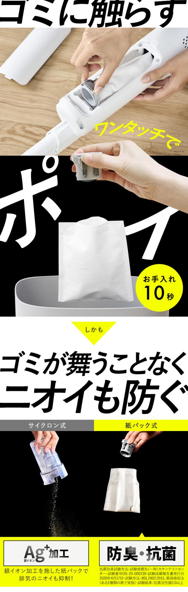 取り出したらそのままゴミ箱へ捨てられる紙パック式なので、ゴミも舞いにくくニオイも防げます。