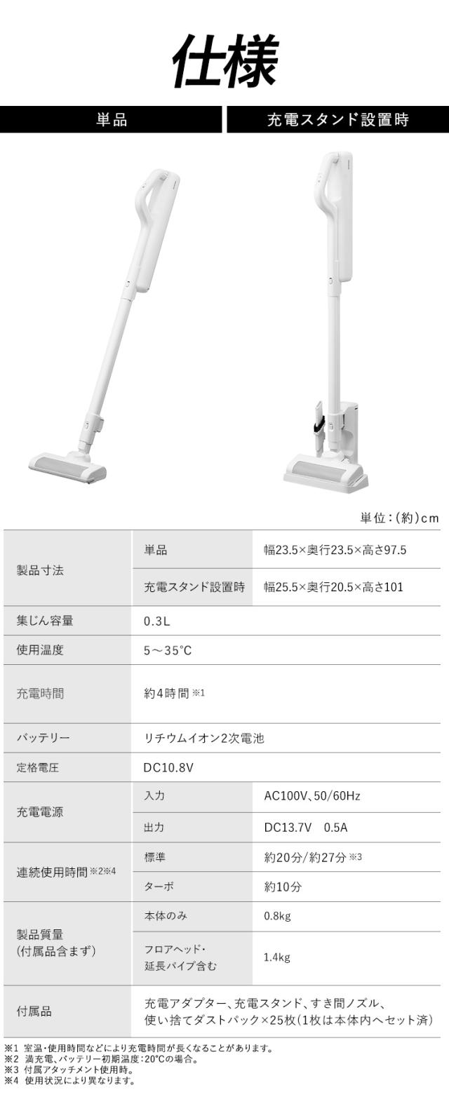 充電アダプター、充電スタンド、すき間ノズル、使い捨てダストパック×25枚(1枚は本体内にセット済)