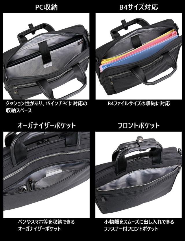 機能一覧:2気室/B4/PC収納(15inch)/セットアップ機能/軽量/ショルダーベルト