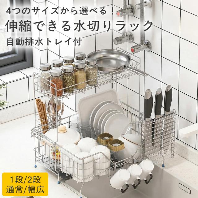 水切りラック シンク上 スリム 伸縮 ステンレス 水切りかご 2段 大容量 食器 シンク横 水筒置き グラススタンド 省スペース シンク内 箸置き ファミリー向け