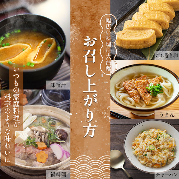 顆粒タイプなので計量しやすく、味噌汁・うどん・鍋料理・だし巻き卵・チャーハンなど、幅広い料理に大活躍。隠し味として加えるだけで、いつもの家庭料理が料亭のような味わいに仕上がります。