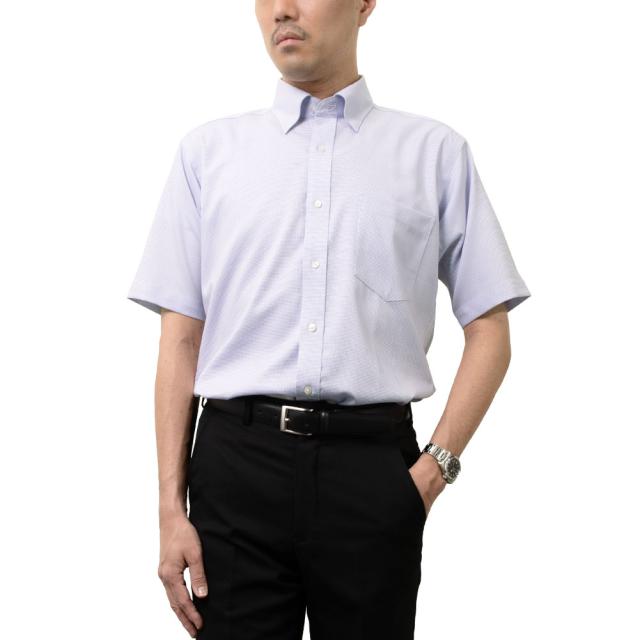 綿100%形態安定加工・ノーアイロンシャツ・ノンアイロン日清紡アポロコット・ドレスシャツ チョーヤスナップダウン パープルドビー 半袖きめ細やかな格子柄織が入ったパープルドビー。衿は、ボタンを外しても衿立ちがキレイなスナップダウンです。綿100%の柔らかな生地に、テープ縫製による縫い目付近のシワ軽減や、縫製後の特殊な熱処理で驚異の形態安定性を実現。ご家庭で洗濯されてもシワが気にならないので、お手入れが簡単。