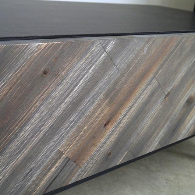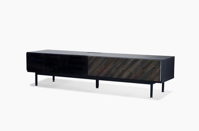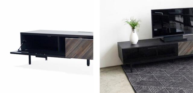 深みのあるアカシア材を斜めに貼り合わせたデザインのローボードです。シックなブラックガラスのフラップ扉と大容量の引出し収納で機能性もばっちりです。