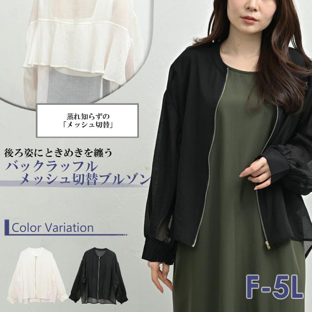 大きいサイズ レディース メッシュ切替ブルゾン 長袖 メール便対応 バックラッフル フリル シアー 上着 ライトアウター F/LL-3L/4L-5L ゆったりサイズ ぽっちゃり女子 プラスサイズ 5月7日10時までP5倍