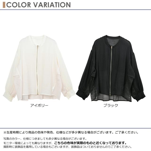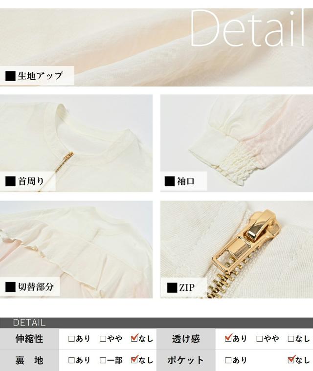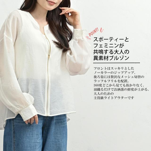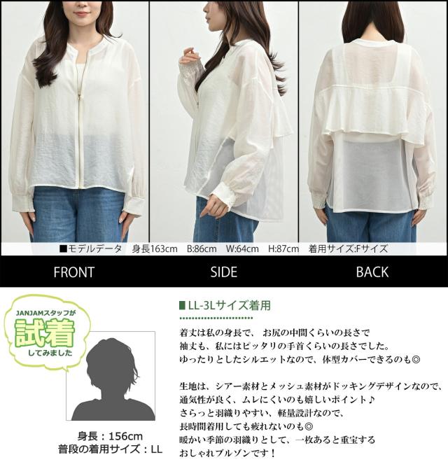 【後ろ姿に、ときめきを纏う】ジップアップブルゾン シアーブルゾン シースルージャケット ノーカラーブルゾン バックラッフルメッシュ切替ブルゾン フリル ティアード ジップアップ 前開きファスナー 長袖 10分袖 十分袖 ロングスリーブ ボリューム袖 ノーカラー ラウンドネック 背面メッシュ バックシャン 透け素材 シアー感 シースルー 羽織り 上着 ライトアウター 冷房対策 レイヤード 重ね着 お尻が隠れる着丈 お尻すっぽり丈 チュニック丈 通気性 蒸れにくい ウォッシャブル 春服 夏服 秋服 春物 夏物 秋物 春秋 春夏 透ける 伸びない 裏地なし ゆったり 大きめ 体型カバー 体型隠し 着回し力 こなれ感 カジュアル フェミニン ナチュラル シンプル 大人可愛い 大人かわいい シンプル ベーシック 上品 海 ビーチ キレイめ かわいい かっこいい 着こなし おしゃれ 定番 春コーデ 夏コーデ 秋コーデ ファッション ぽっちゃり プラスサイズ ゆったりサイズ 女性用 婦人用 women ミセス ママ レディースファッション 30代 40代 50代 2026 夏新作 春 夏 秋 黒 白 ブラック アイボリー ホワイト F LL 3L 4L 5L 2L XL XXL XXXL XXXXL 2XL 3XL 4XL 5XL 9号 13号 15号 17号 19号