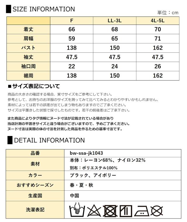 LL-3L:着丈68 肩幅65 バスト150 袖丈47.5 袖口周24 裾周150
