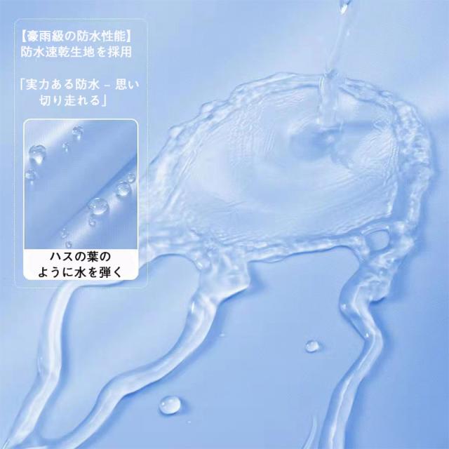 ゲリラ豪雨にも対応する高い防水性能。雨がしっかり弾かれ、全身をしっかりガードします。