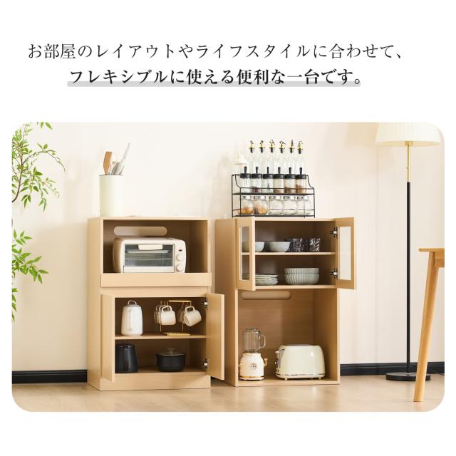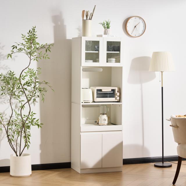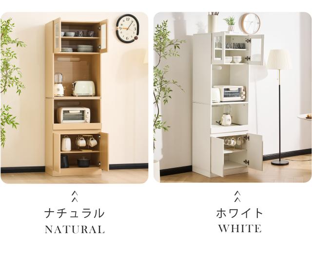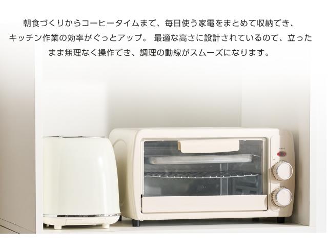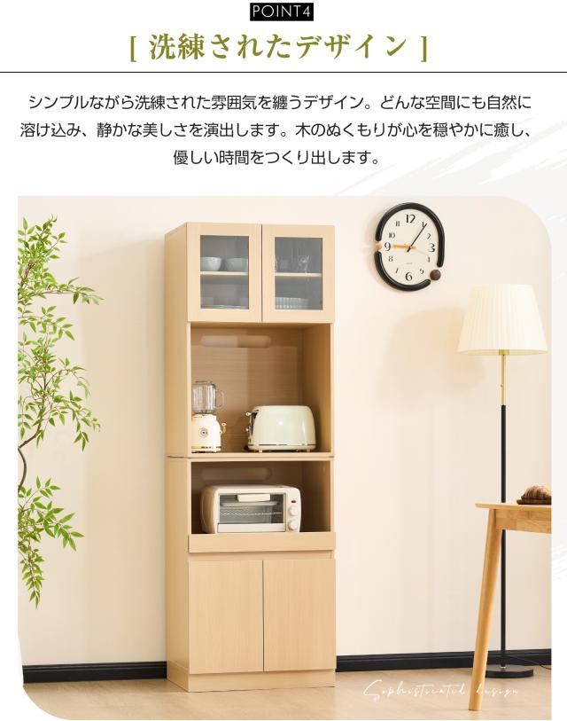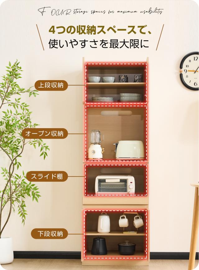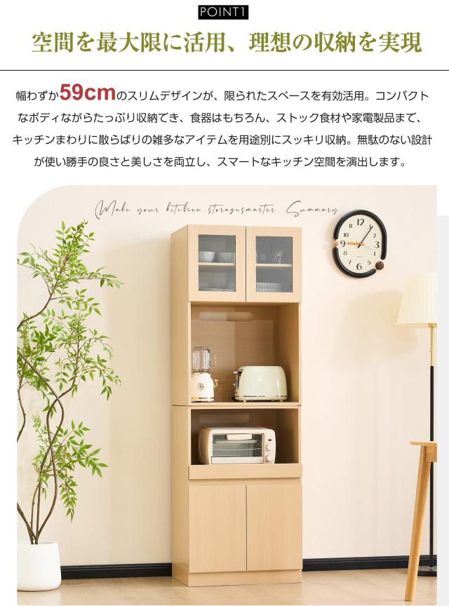 【空間を最大限に活用、理想の収納を実現】幅わずか59cmのスリムデザインが、限られたスペースを有効活用。コンパクトなボディながらたっぷり収納でき、食器はもちろん、ストック食材や家電製品まで、キッチンまわりに散らばりの雑多なアイテムを用途別にスッキリ収納。無駄のない設計が使い勝手の良さと美しさを両立し、スマートなキッチン空間を演出します。