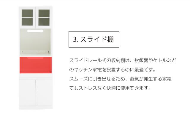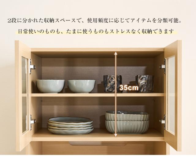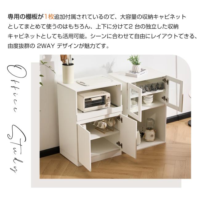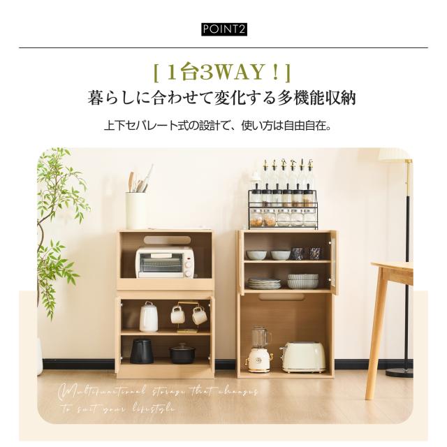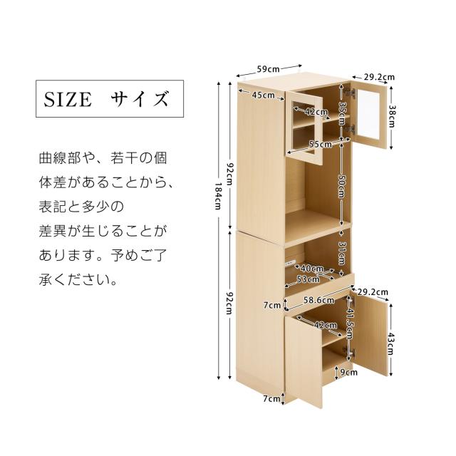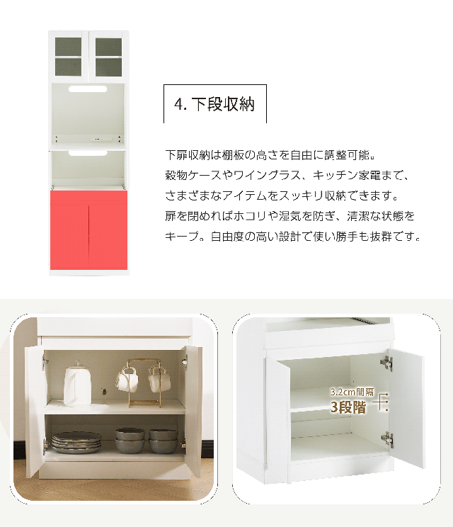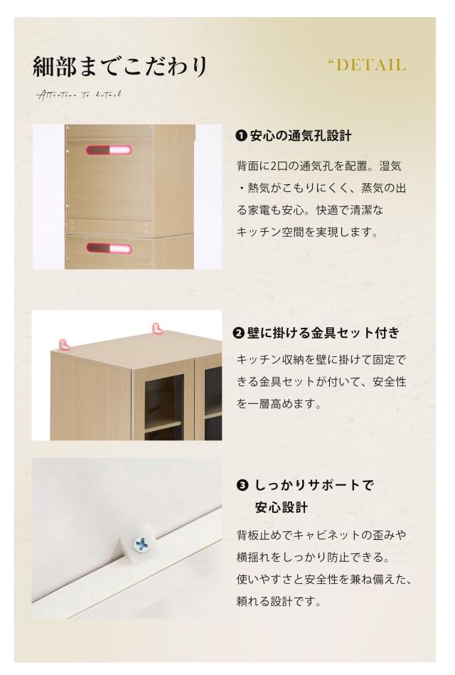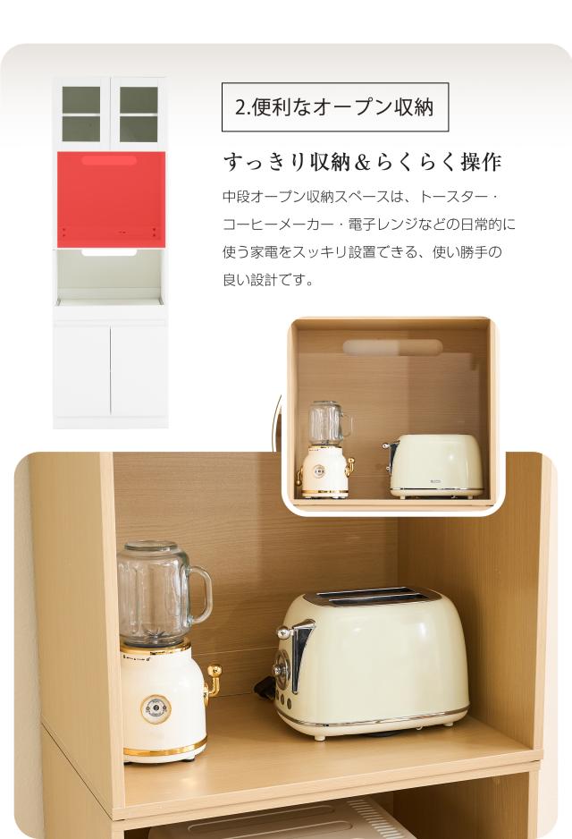 【空間を最大限に活用、理想の収納を実現】幅わずか59cmのスリムデザインが、限られたスペースを有効活用。コンパクトなボディながらたっぷり収納でき、食器はもちろん、ストック食材や家電製品まで、キッチンまわりに散らばりの雑多なアイテムを用途別にスッキリ収納。無駄のない設計が使い勝手の良さと美しさを両立し、スマートなキッチン空間を演出します。