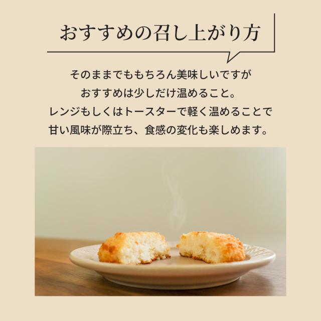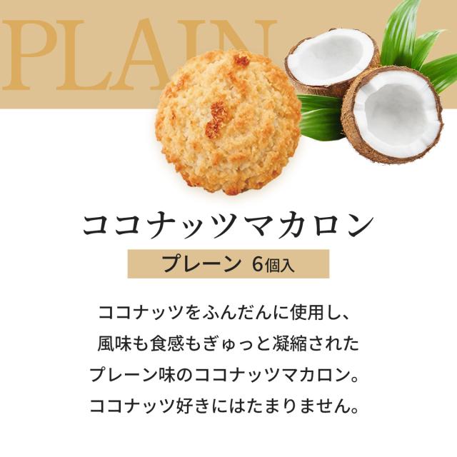 | 原材料名 | 【プレーン】ココナッツ、砂糖、グルコースシロップ、卵白、じゃがいもでん粉、ぶどう糖、米粉、(一部に卵を含む) 【キャラメル】ココナッツ、砂糖、グルコースシロップ、卵白、キャラメルチップ(加糖脱脂練乳、砂糖、グルコースシロップ、バター脂)、ばれいしょでん粉、ぶどう糖、米粉、食塩/香料、カラメル色素、ソルビトール、乳化剤、(一部に卵・乳成分を含む) |