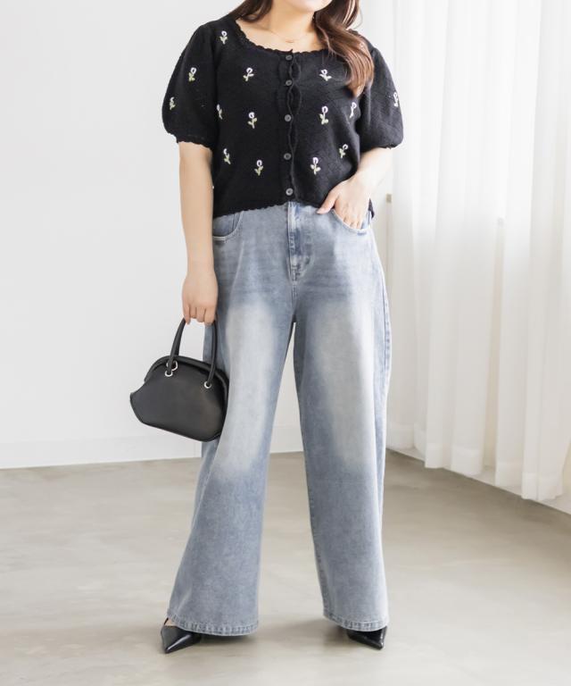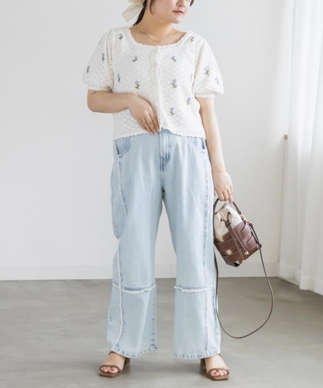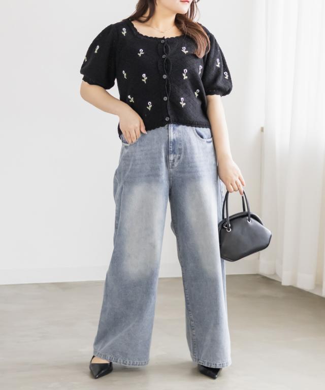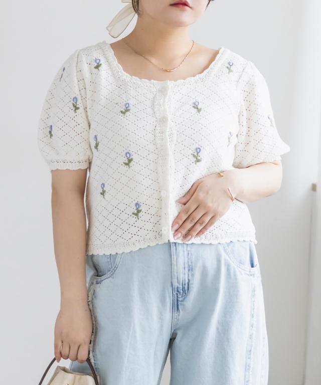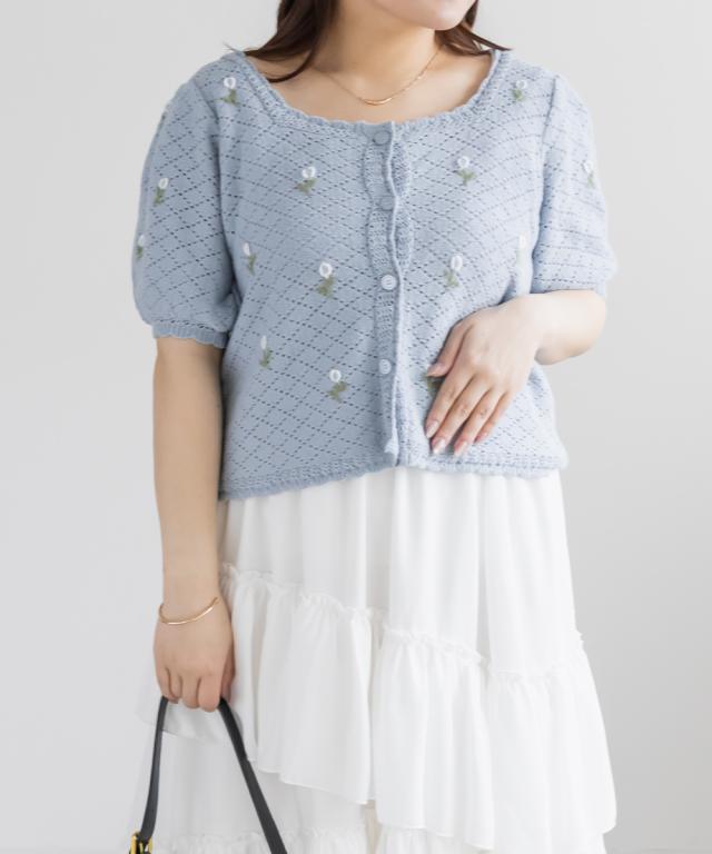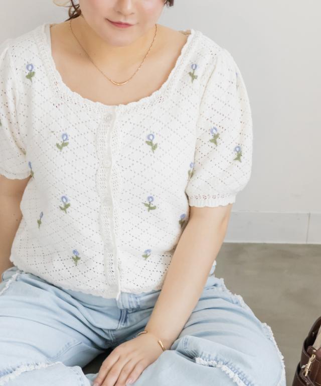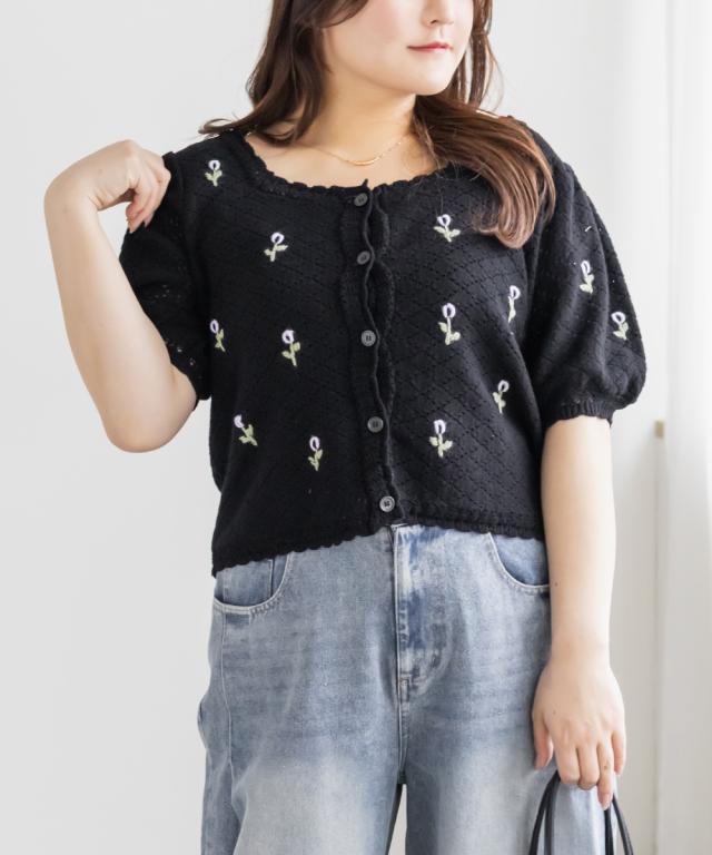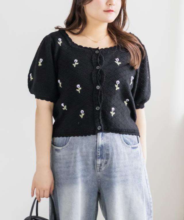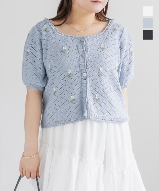 大きいサイズ/レディース/LL/3L/4L/CLETTEオリジナル花刺繍透かし編みニットカーディガン
