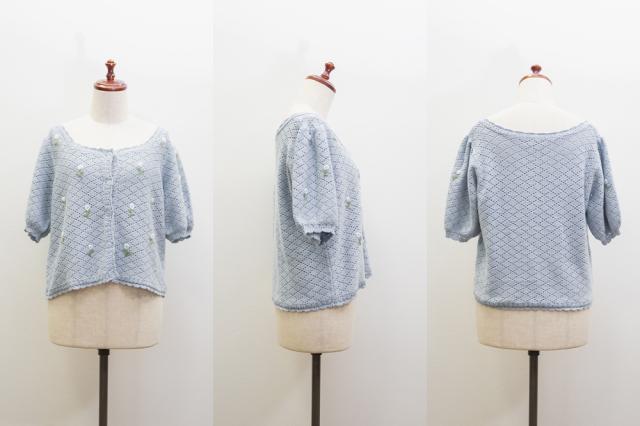 | 起毛感の少ない春夏向けの糸で、格子状の透かし編みでしあげたサマーニット。 |