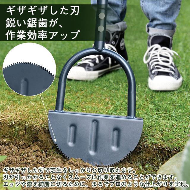 半月型の刃が、芝生のフチや境界線をキレイにカット。歩道や花壇との境目も、この一本でプロ並みに仕上がります。
