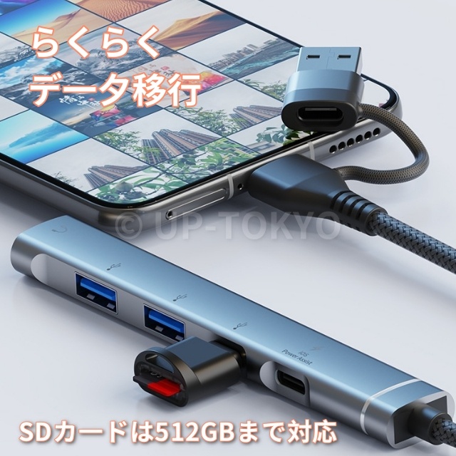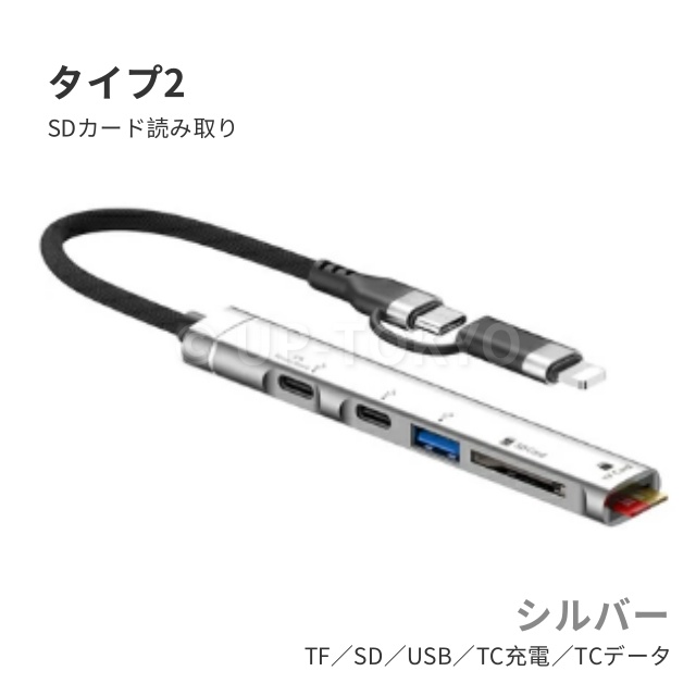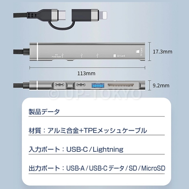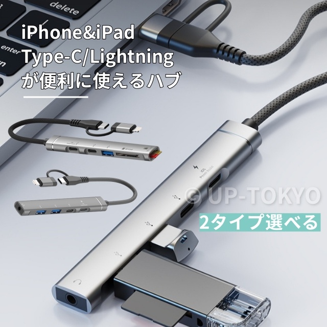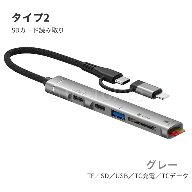 USB-CコネクタとLightningコネクタを搭載。SDカード・microSD・USBメモリを同時に使えるUSBハブ兼SDカードリーダーです。