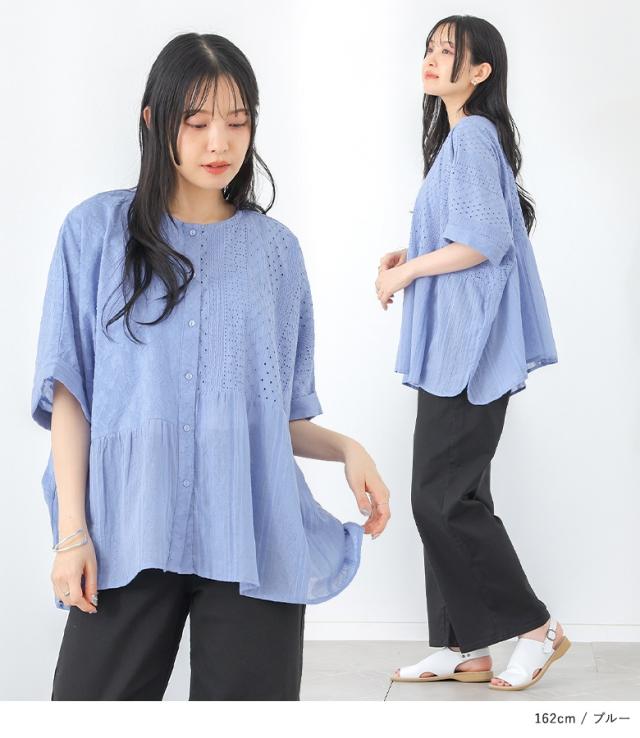 ブラウス レディース トップス 半袖ブラウス バンドカラー シャツ 刺繍 ギャザー タック 春 夏 オシャレウォーカー 【TP】 半袖シャツ ボタンシャツ 前開きシャツ 半袖 前後2way 2way ドビー 無地 ジャガード ジャカード 洗える おうちで洗える 洗濯機で洗える ウォッシャブル マシンウォッシャブル 薄手 涼しい カジュアル シンプル ナチュラル キレカジ フェミニン ガーリー 可愛い系 大人女子 大人可愛い お洒落可愛い 大人カジュアル ベーシック ニュアンス ラフ ゆったり ゆる 楽ちん 二の腕カバー Sサイズ Mサイズ Lサイズ 10代 20代 30代 40代 50代 60代 低身長 高身長 女子会 オフィス 通勤 通学 お買い物 お出掛け 旅行 おしゃれ お洒落 トレンド 流行 osharewalker osharewalker 白色 白 アイボリー ブルー 青色 青 ブラック 黒色 黒[ID]11tp018[前後2way総刺繍パネル切替ブラウス]