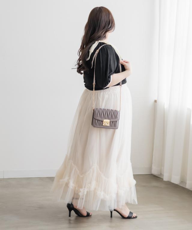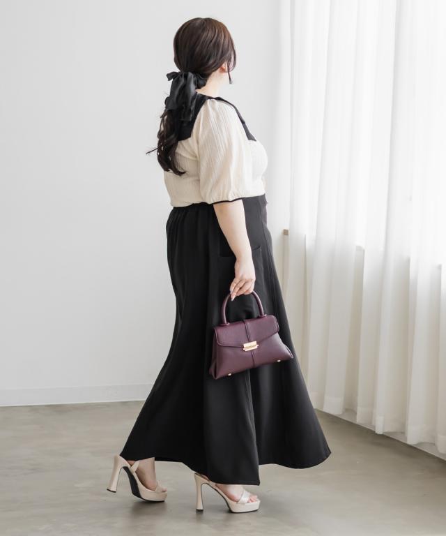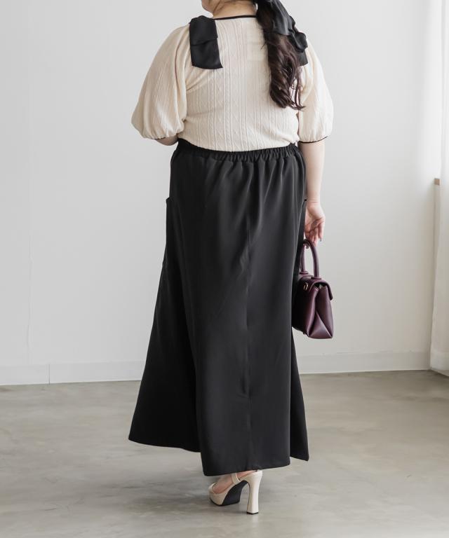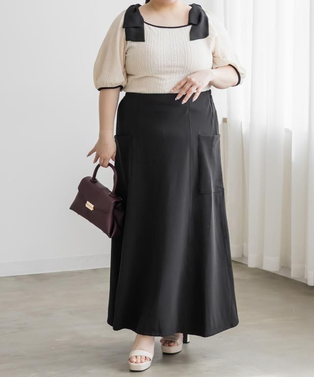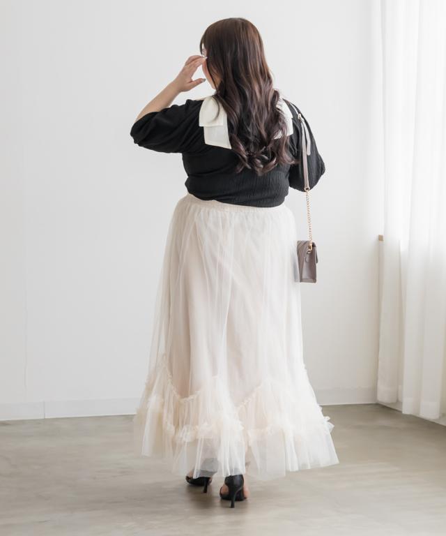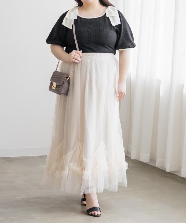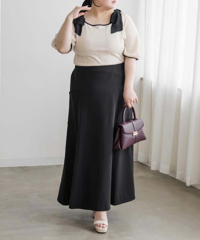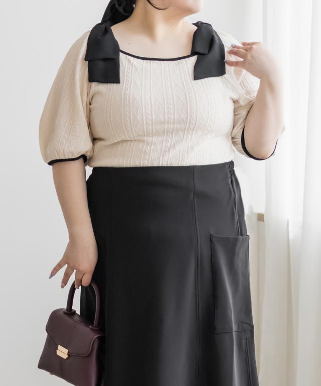 | 3Lサイズを着用しました。身幅や肩まわりもちょうどいい着心地でしたとても軽く凹凸のある生地がボディラインを拾いづらくしてくれます。スクエアネックがデコルテをすっきり見せてくれて、肩のリボン華やかな印象に♪ スカート合わせでフェミニンに、パンツ合わせで甘さを抑えた着こなしも楽しめる、着映えトップスだと思いました。 |