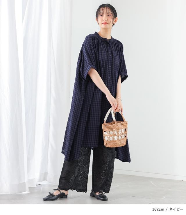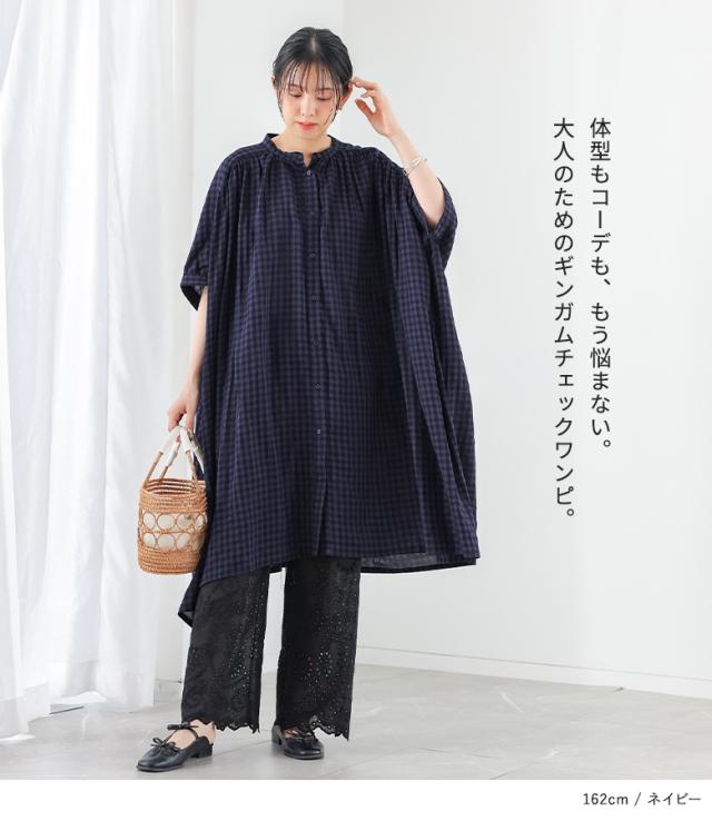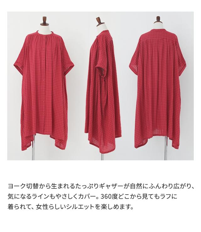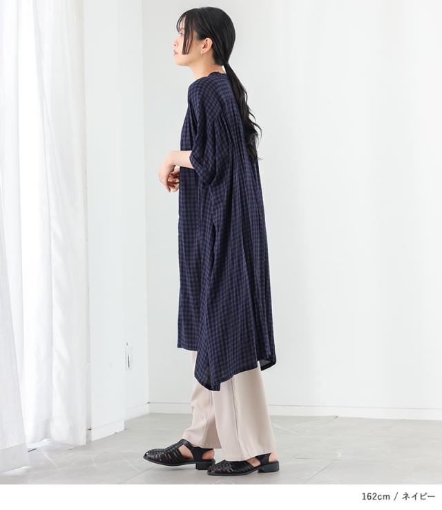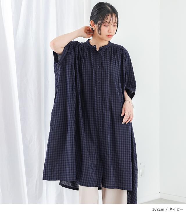 【P10倍】<春新作>『ギンガムチェック5分袖ワンピース』【メール便不可】【20】[ワンピース レディース 半袖ワンピース ロング丈シャツ 羽織り バンドカラー チェック柄 ギャザー 春 夏 オシャレウォーカー]