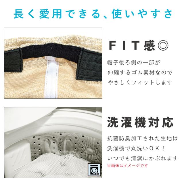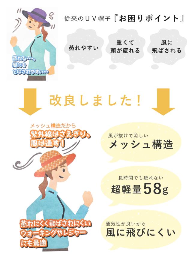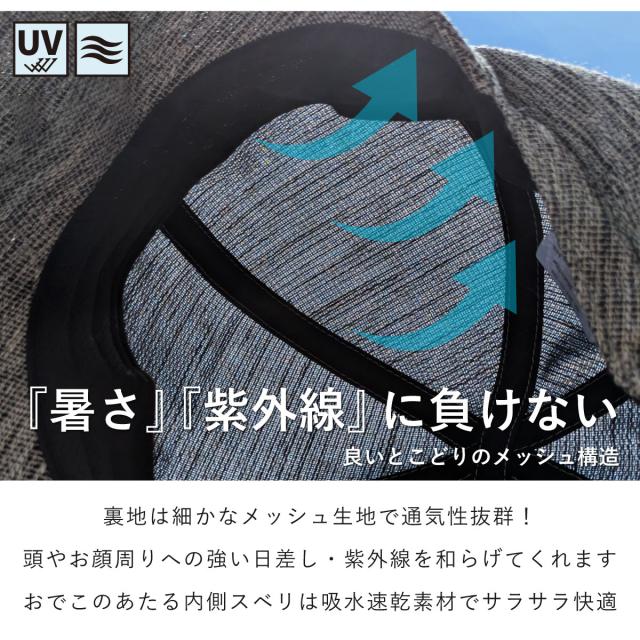 帽子全体がメッシュ構造で通気性抜群でムレにくく、軽やかなのにしっかり紫外線対策も◎