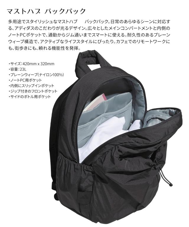 adidas マストハブ バックパック 23L リュック デイパック バッグ PC収納 ノートPCポケット サイドポケット フロントポケット 通勤 通学 ジム デイリー 普段使い 23リットル 多機能 ナイロン 調節可能ストラップ カーボン HY878