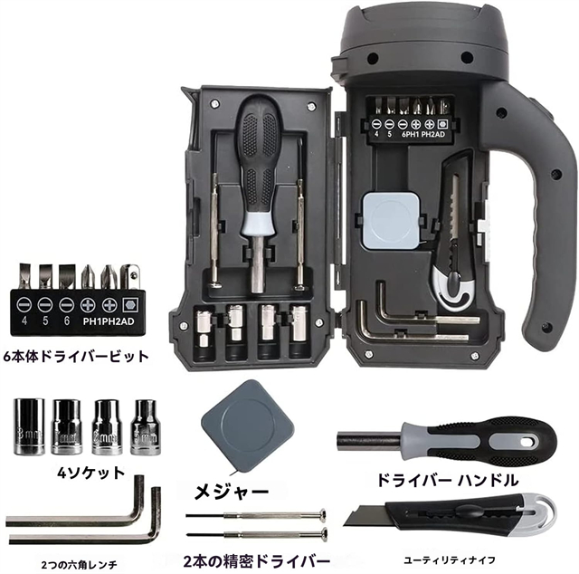 ハンドル、ソケット、ビット、カッターナイフなどのツールが内蔵されており、操作が便利で簡単です。