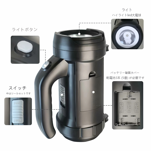 ・この高輝度懐中電灯は乾電池で動作し、環境に優しく、経済的で安全です。
